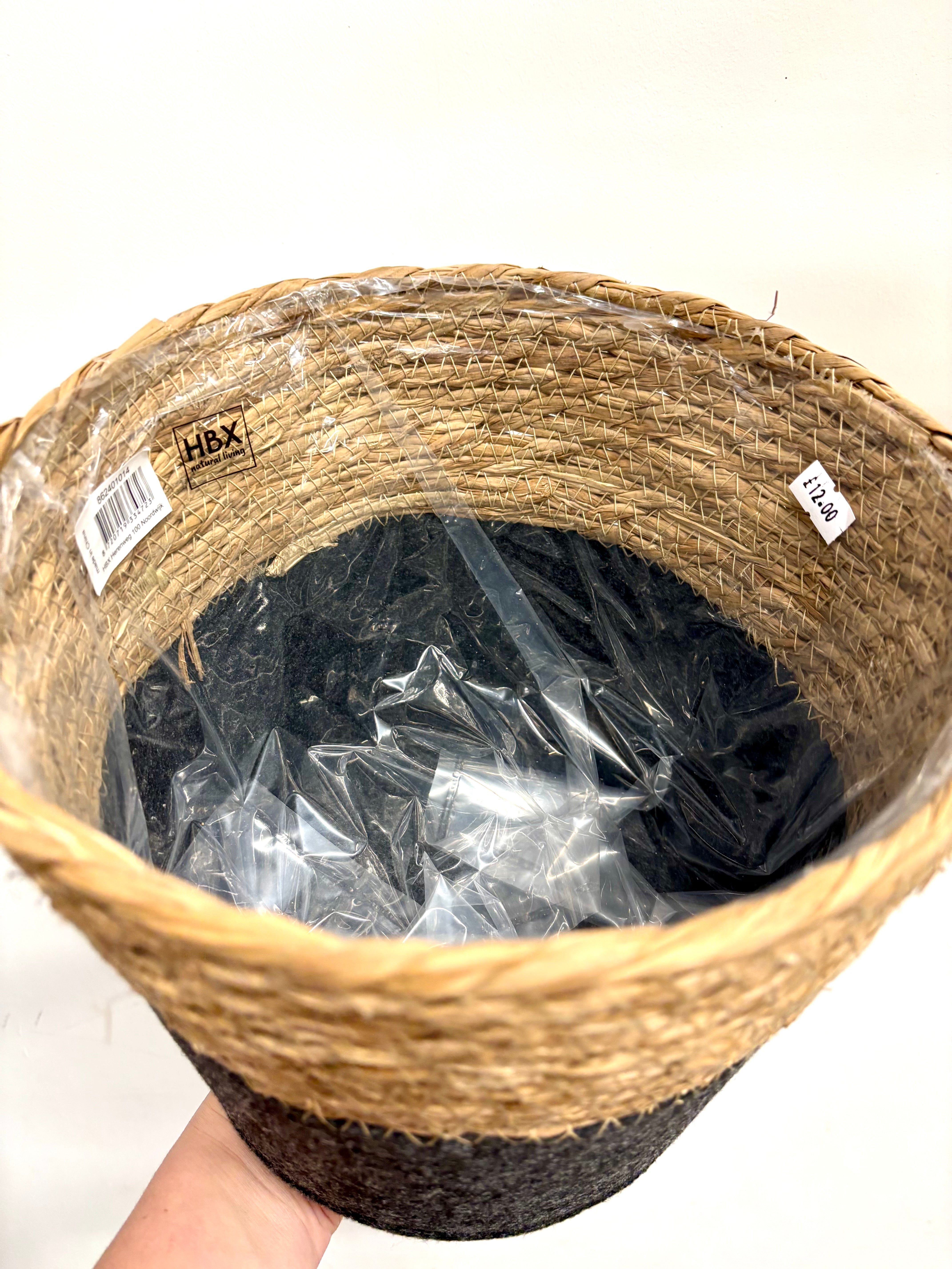 Wicker pot Wicker pot with a grey felt to the bottom. Fully lined. 22cm diameter x 22cm height Read more