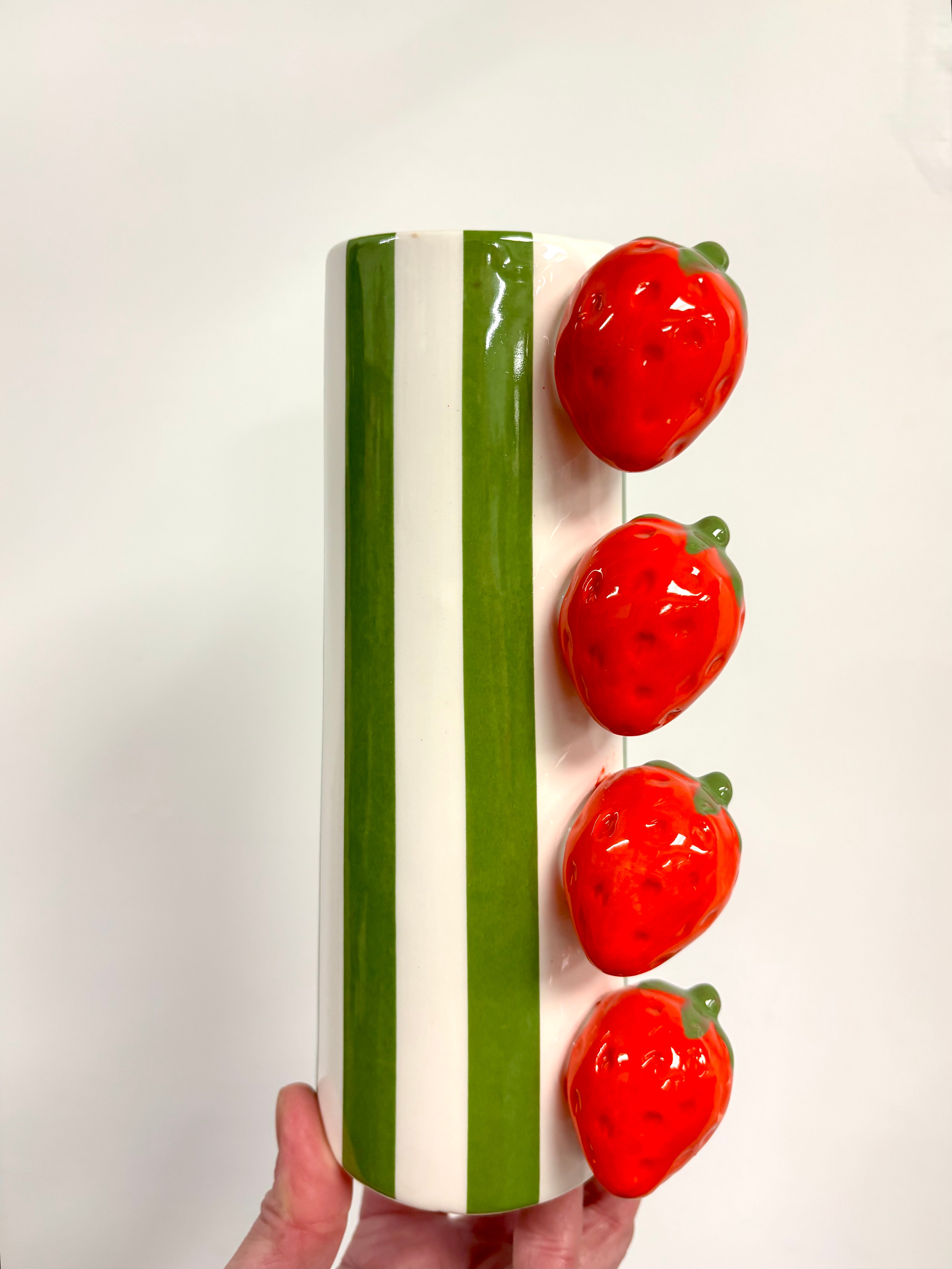Strawberry vase Striped modern ceramic vase with 3D strawberries. 21cm high / 5cm diameter hole approximately Read more