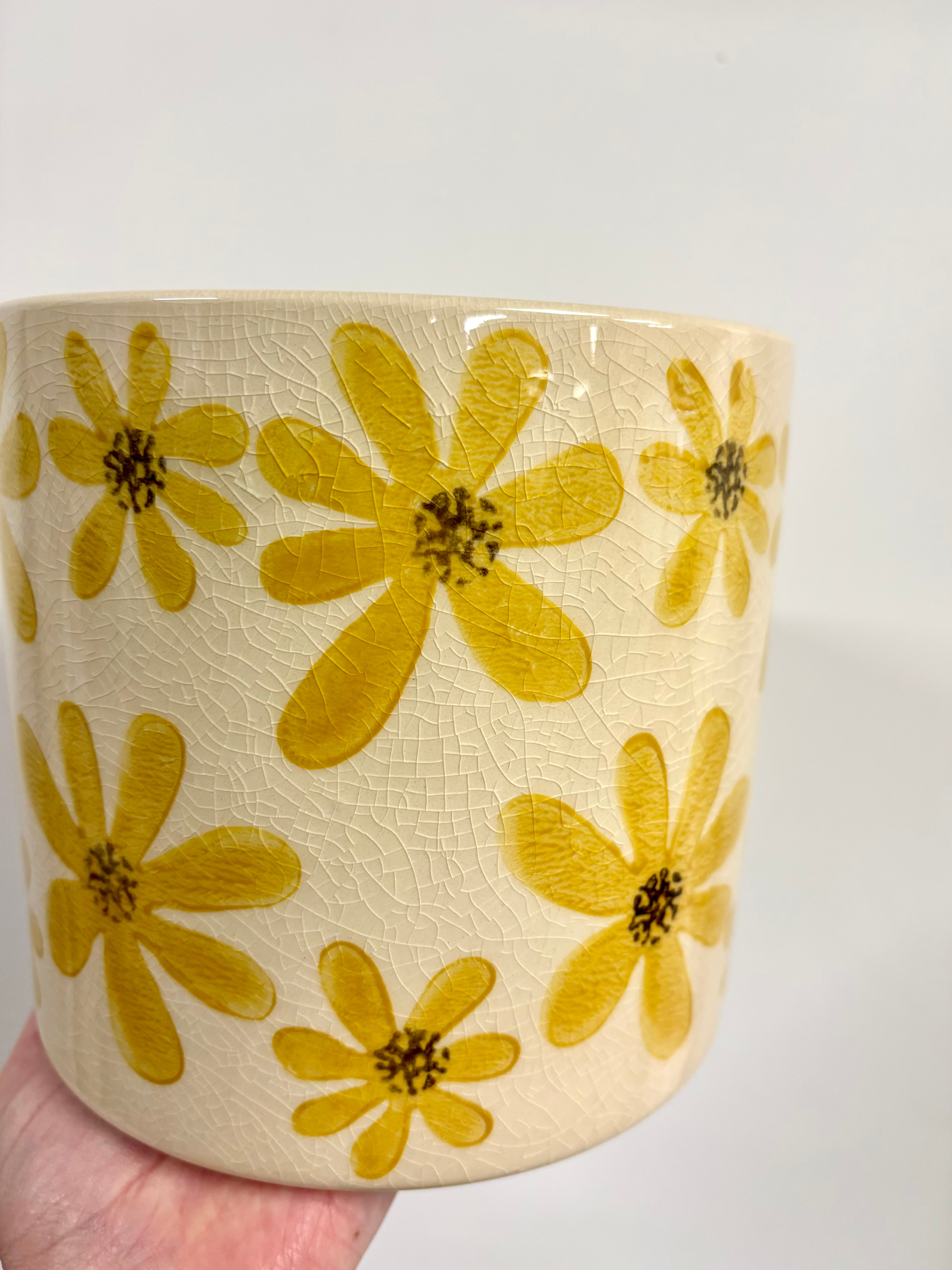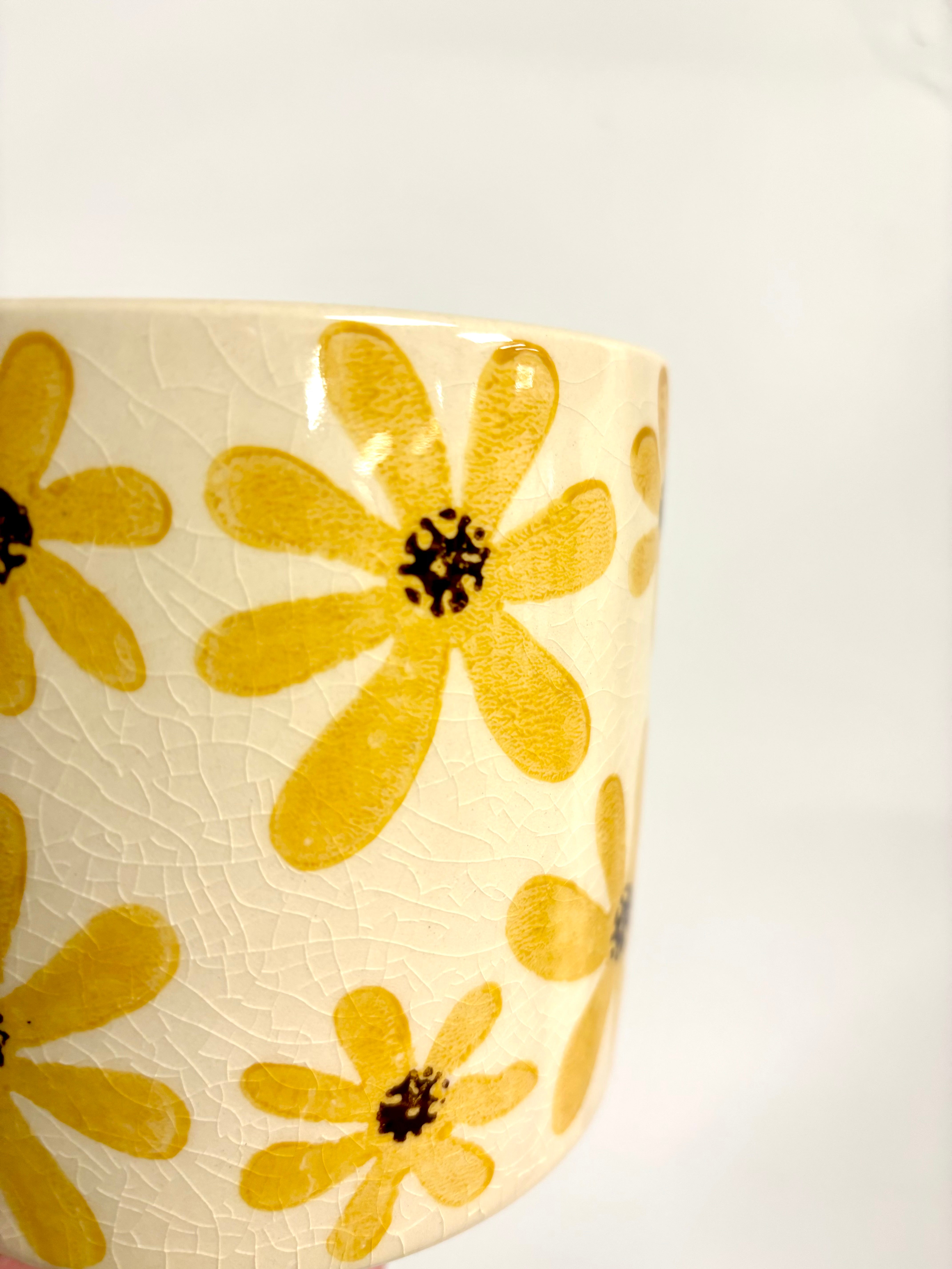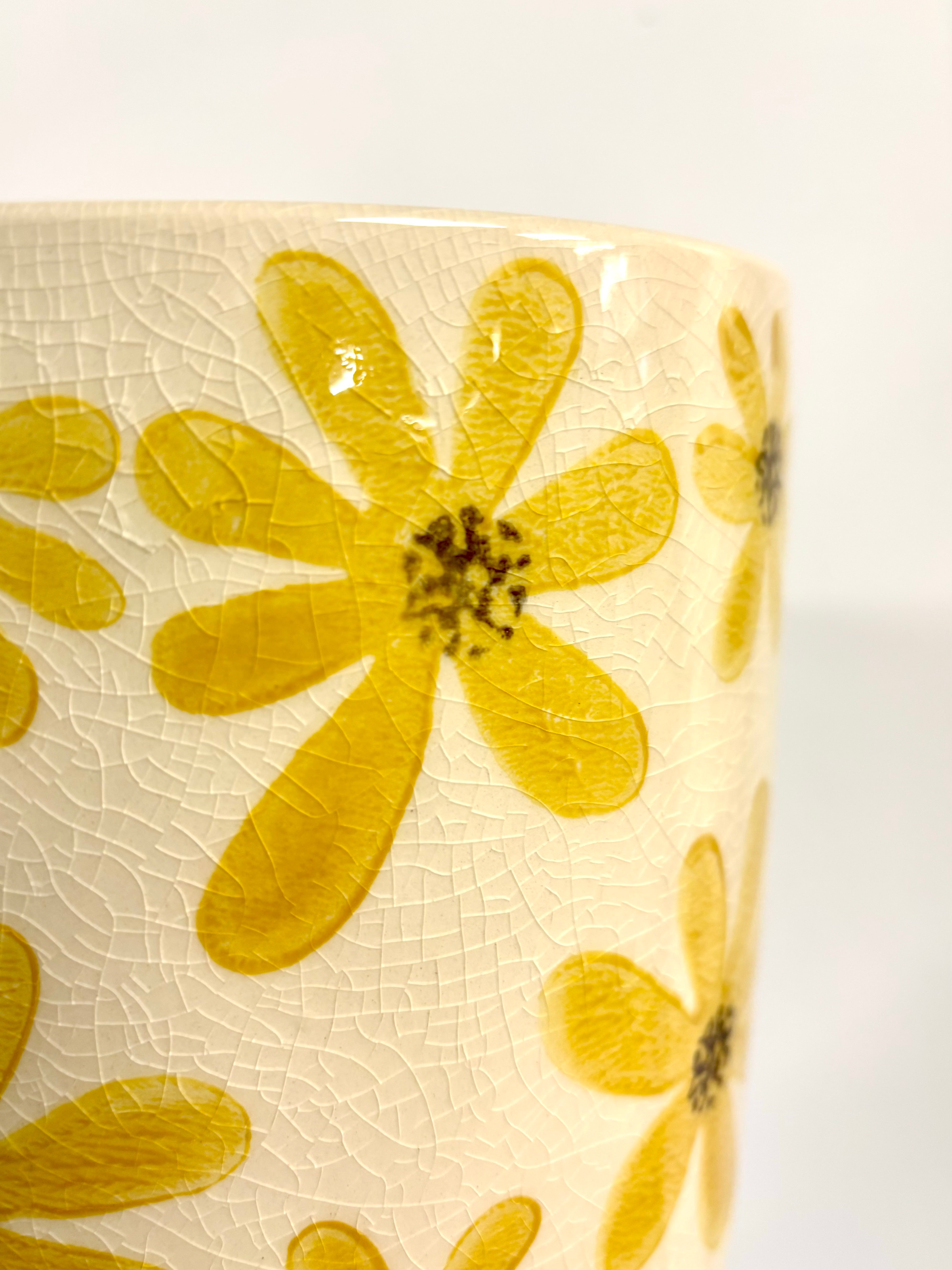 Yellow flower pots Set of 3 glazed yellow floral design plant pots. Perfect for nursery pots of - 14.5cm/12cm/10cm Read more